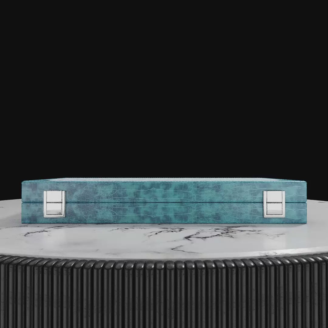 Our Signature Blue Lagoon Backgammon is crafted from embossed faux alligator leather with a sleek, modern aesthetic.