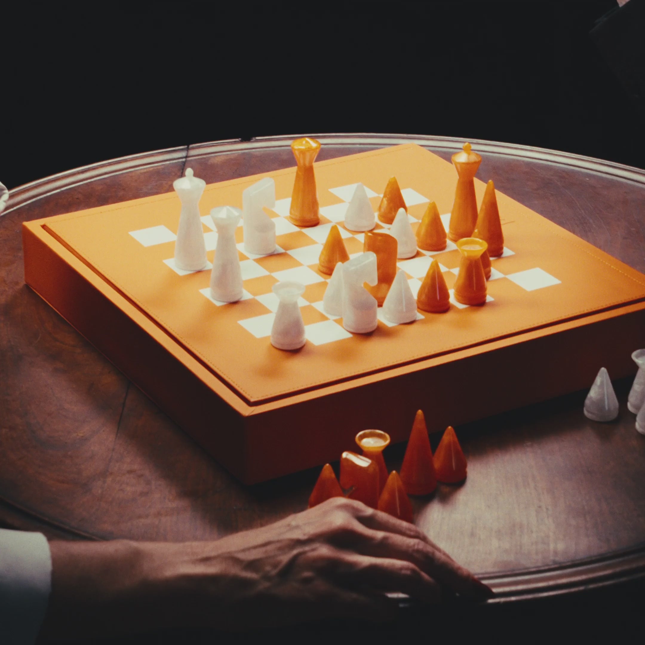 The set includes 32 sculptural chess pieces with a modern silhouette, custom-made exclusively for this edition.